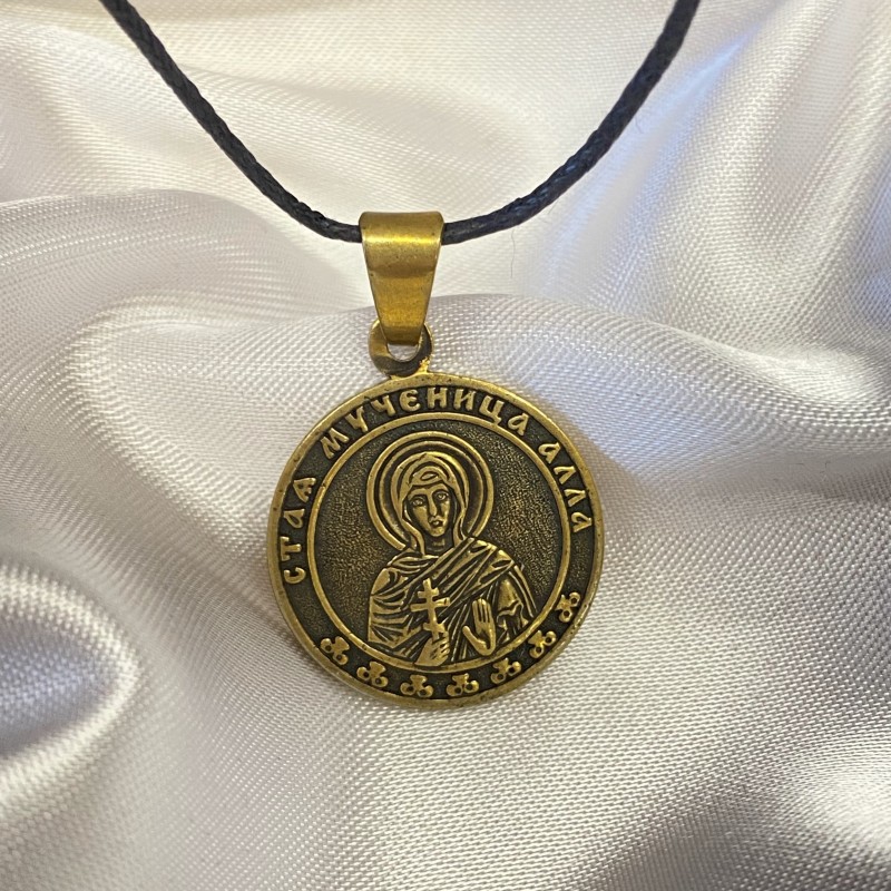 Bronzene Anhängerikone auf einer schwarzen starken Schnur.