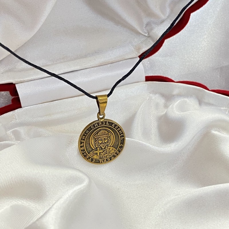 Bronzene Anhängerikone auf einer schwarzen starken Schnur.