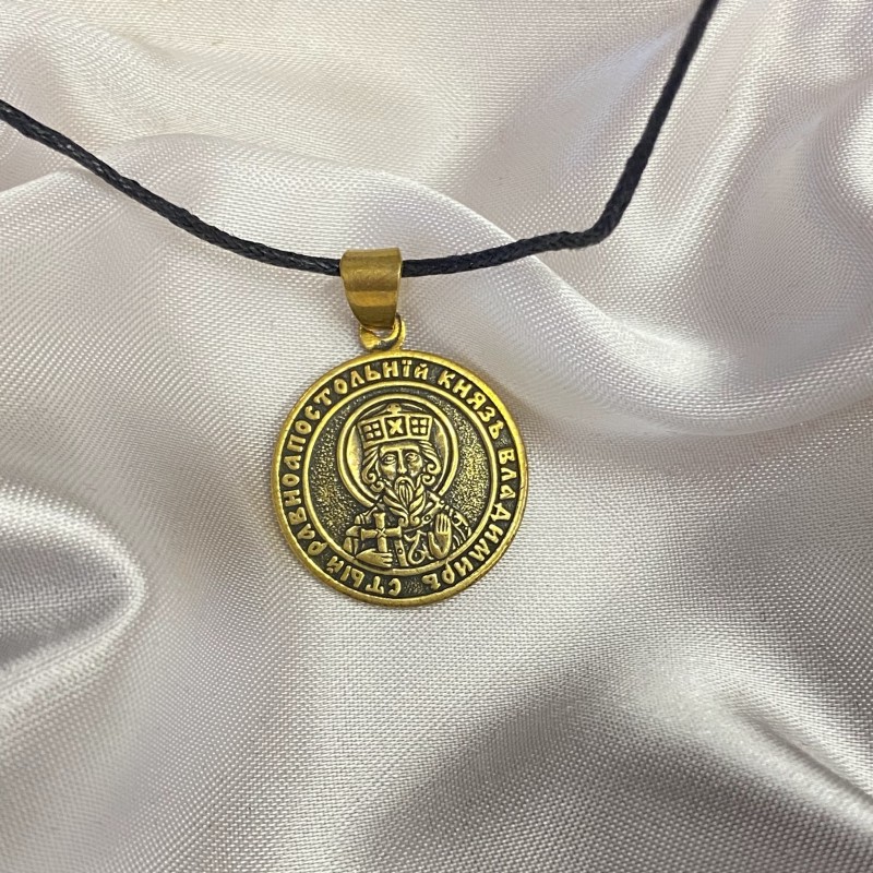 Bronzene Anhängerikone auf einer schwarzen starken Schnur.