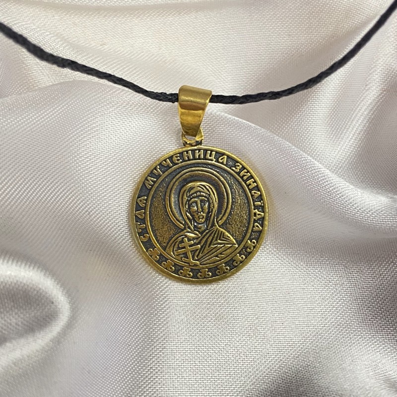 Bronzene Anhängerikone auf einer schwarzen starken Schnur.