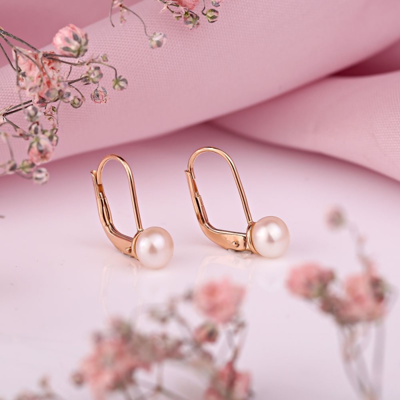 Очаровательные серьги изкрасного золота 585 пробы, со вставками очаровательного белого жемчуга. Превосходный подарок для любимой, который прекрасно подчеркнет нежность, очарование и естественность её красоты!