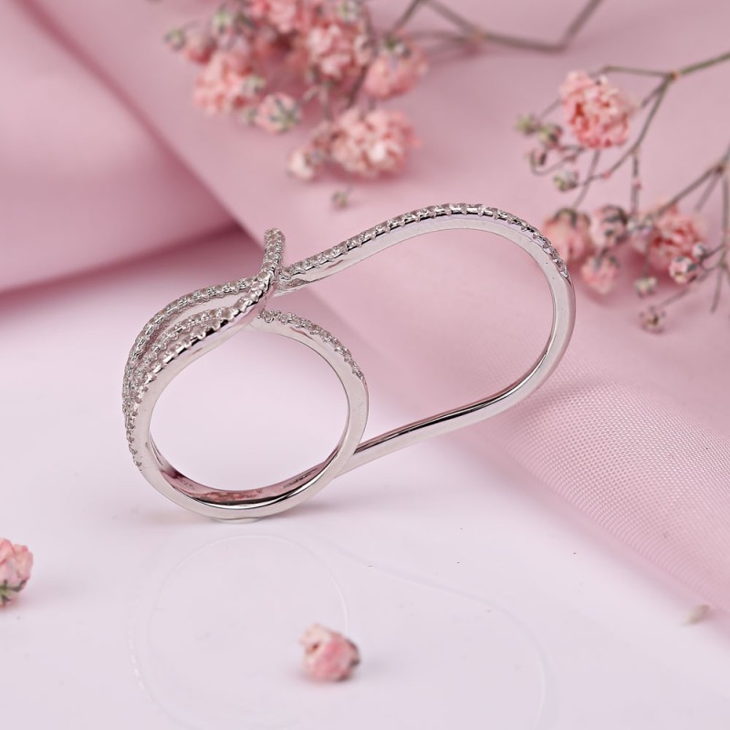 Zwei-Finger-Ring ist ein klarer Beweis für Innovation und Einfallsreichtum. Über zwei Finger erstreckt sich dieser hochwertig designte Doppel-Ring aus 925er Sterling Silber und lässt jede Frauenhand zum Blickfang werden. Mit funkelnden weißen Topasen verziert, hat dieser Ring auch einen angenehmen Tragekomfort. Getragen wird er an Ring- und Mittelfinger. Bitte beachten Sie, dass die angegebene Größe sich auf den Ringfinger bezieht und der Ring, der für den Mittelfinger vorgesehen ist, eine Größe weiter ist.