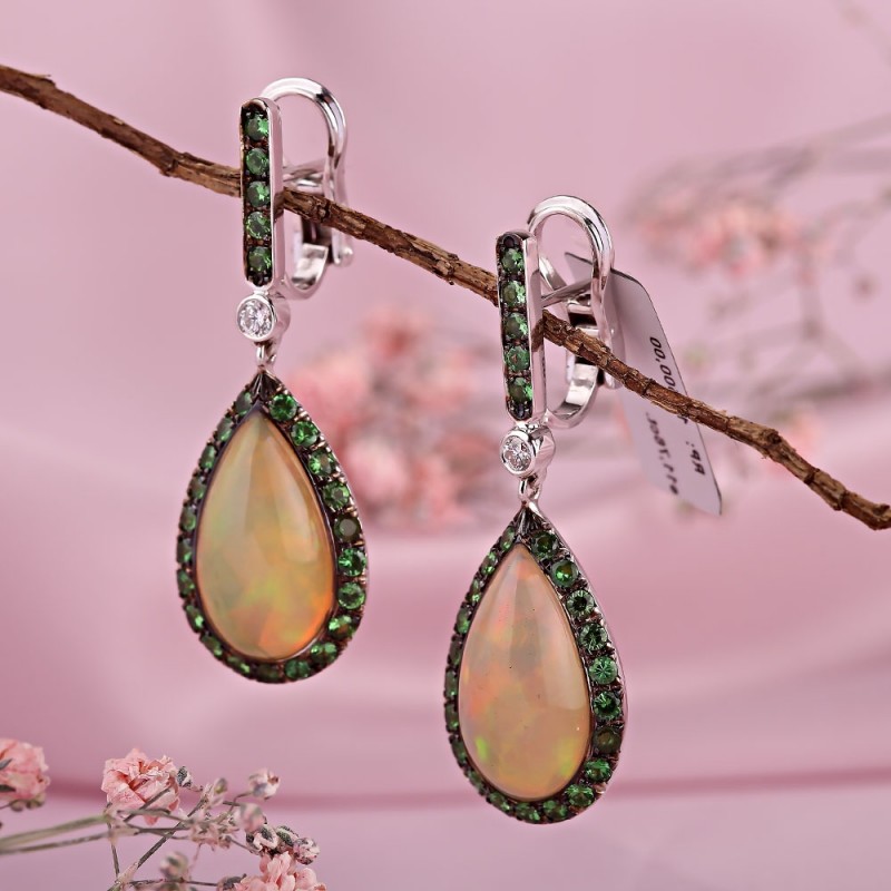 Einsatz: 2 Diamanten 0,08 ct. Gsi Ø 2,5 mm; 54 Tsavorit 2,16 ct. Ø 2,0 mm; 2 Opale 11,76 ct. Tropfen 11,0 x 19,8 mm