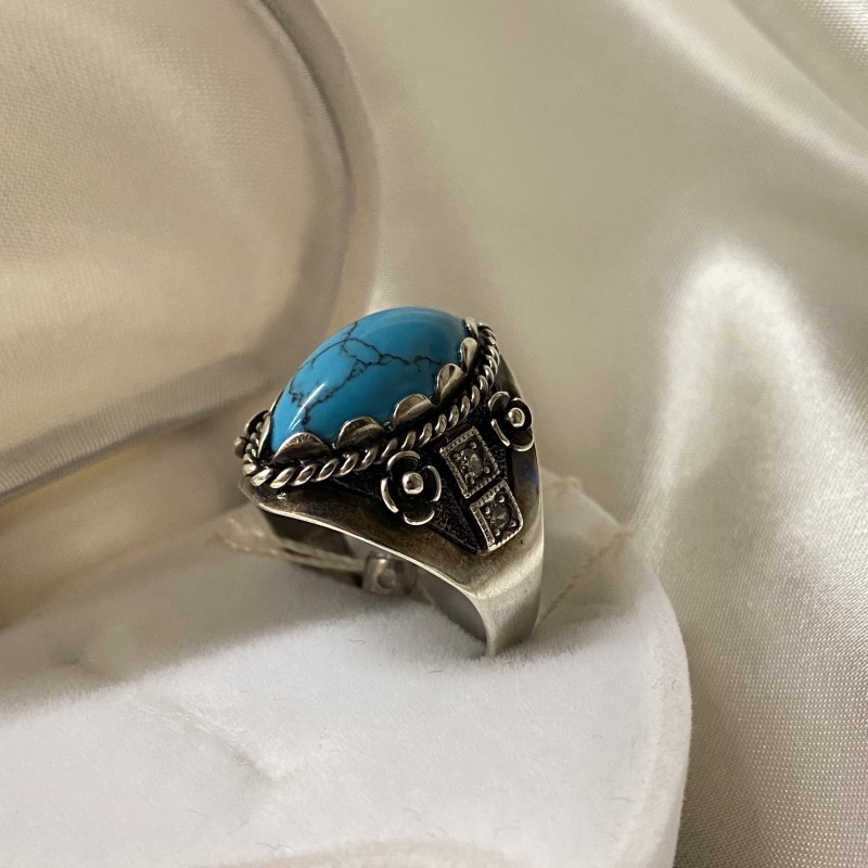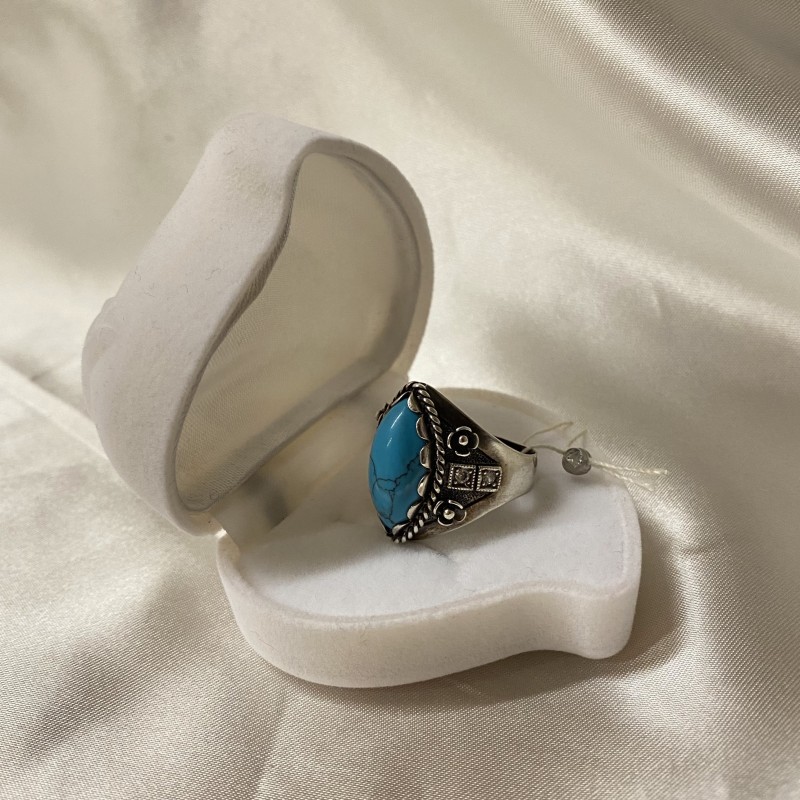 Herrlicher Ring mit charmanten Türkis und Zirkonia in einem schönen Silberrahmen aus 925er Silber, geschwärzt.
