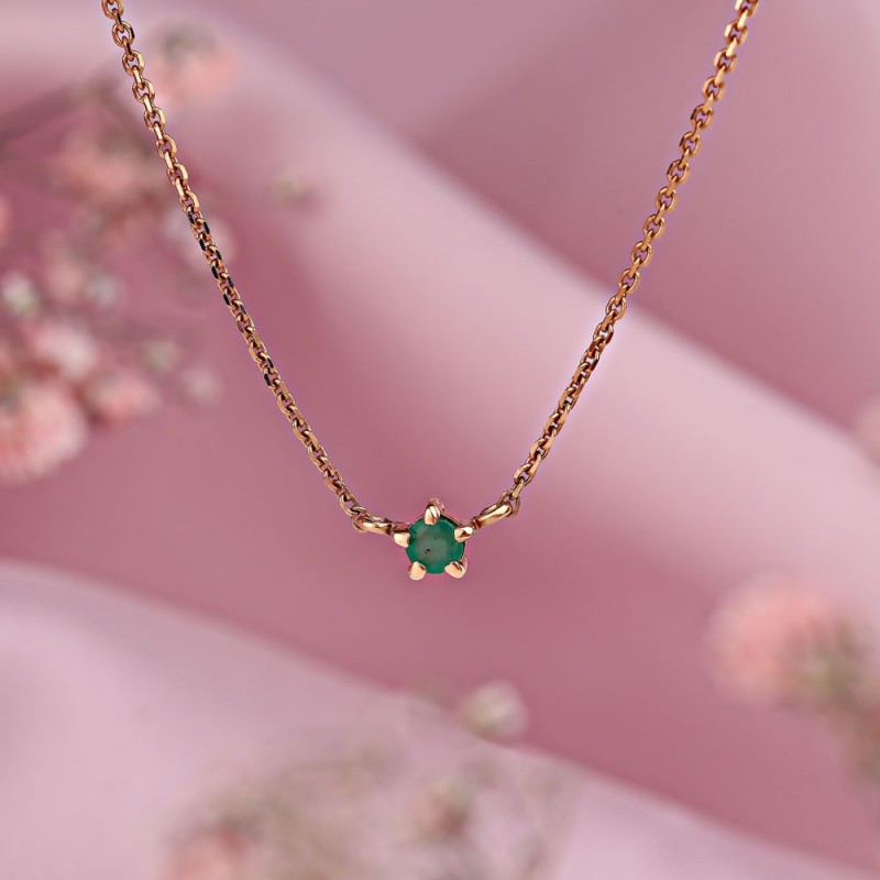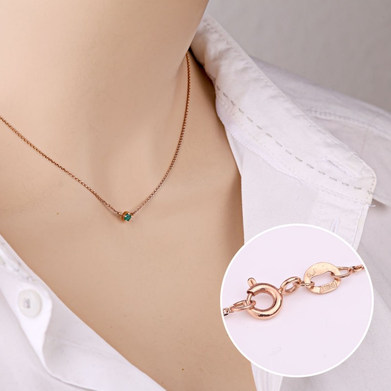 красного золота 585 пробы, украшенное вставкой очаровательного изумруда. Цепь - якорное плетение с алмазной огранкой.
