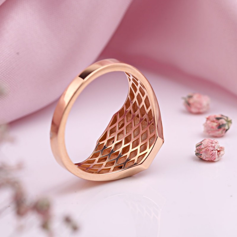 Rotgold mit einem Gitterunterteil. Die obere, hochglanzpolierte Plattform ist mit einem dekorativen Einsatz aus schwarzen Zirkonia und Emaille verziert. Auf der inneren, geschlossenen Fläche des Rings befindet sich ein Stempel mit der Goldprobe.