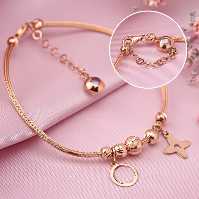 Elegantes, feminines Armband aus 14 Karat Rotgold in Form einer Kordel mit charmanten Anhängern. Dank dem Diamantschliff erhielten die Anhänger ein originelles Muster. Ein solches Armband wird anmutige Frauenhände perfekt schmücken! Ein wunderbares Geschenk für einen lieben Menschen!