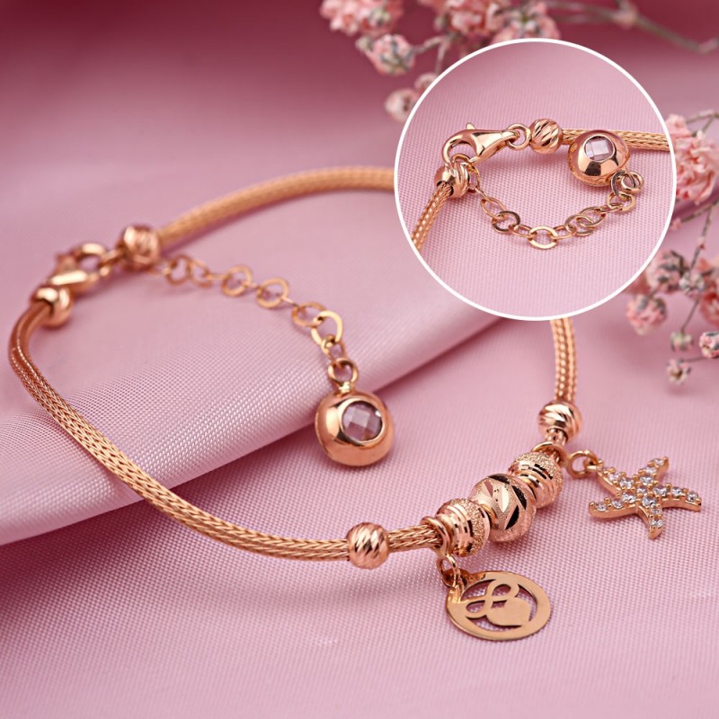 Размер браслета регулируется от 17.5 до 20 см с помощью дополнительной цепочки, на конце которой висит подвеска Ø 7.0 мм со вставкой сверкающего циркония Ø 3.5 мм.