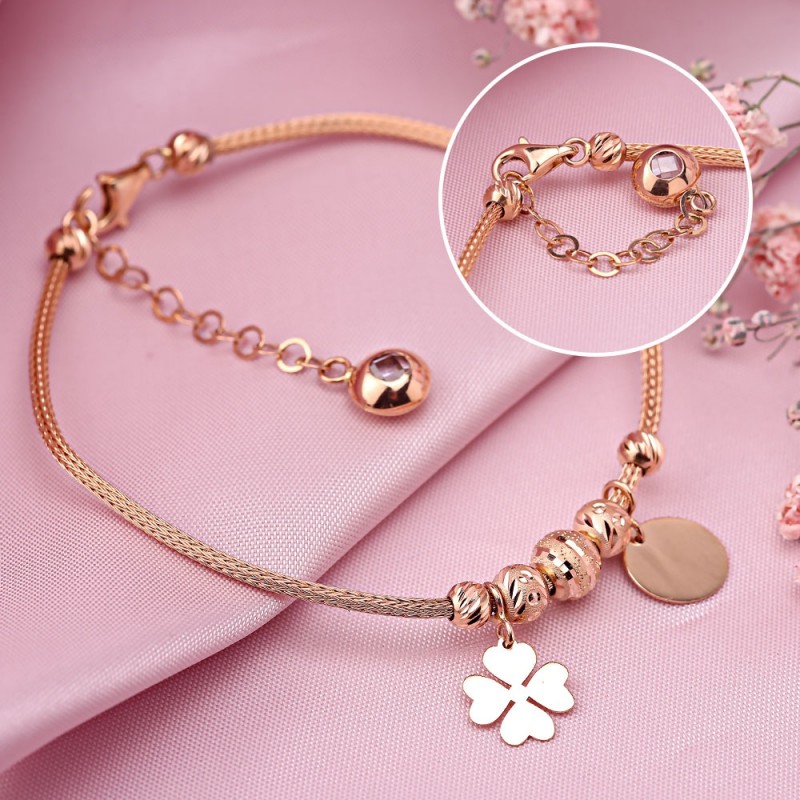 красного золота 585 пробы в виде жгута с очаровательными подвесками. Подвески получили оригинальный рисунок благодаря алмазной обработке. Такой браслет превосходно украсит изящные женские руки! Прекрасный подарок для любимого человека!