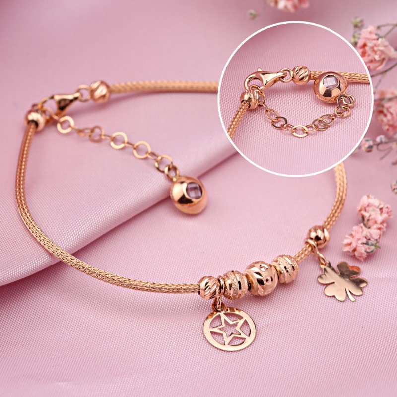 красного золота 585 пробы в виде жгута с очаровательными подвесками. Подвески получили оригинальный рисунок благодаря алмазной обработке. Такой браслет превосходно украсит изящные женские руки! Прекрасный подарок для любимого человека!
