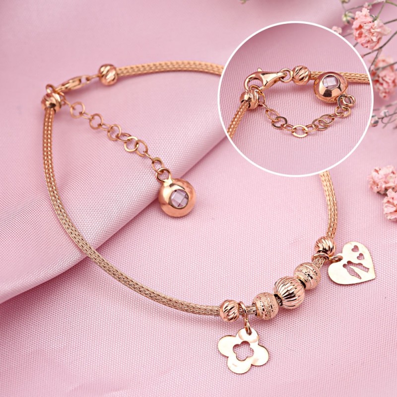 красного золота 585 пробы в виде жгута с очаровательными подвесками. Подвески получили оригинальный рисунок благодаря алмазной обработке. Такой браслет превосходно украсит изящные женские руки! Прекрасный подарок для любимого человека!