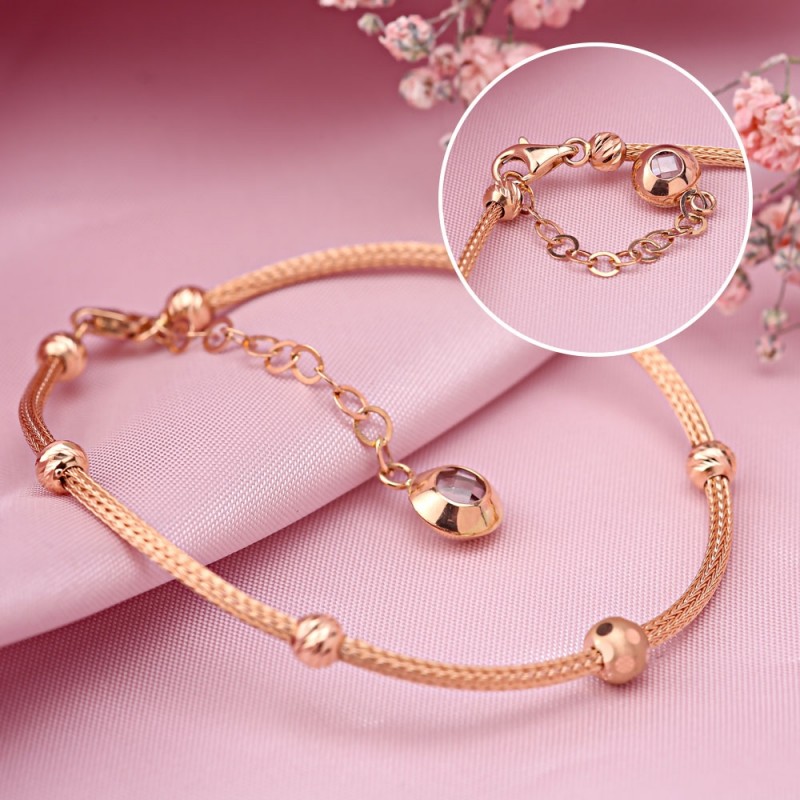 Размер браслета регулируется от 17 до 20 см с помощью дополнительной цепочки, на конце которой висит подвеска Ø 7.0 мм со вставкой сверкающего циркония Ø 3.5 мм.