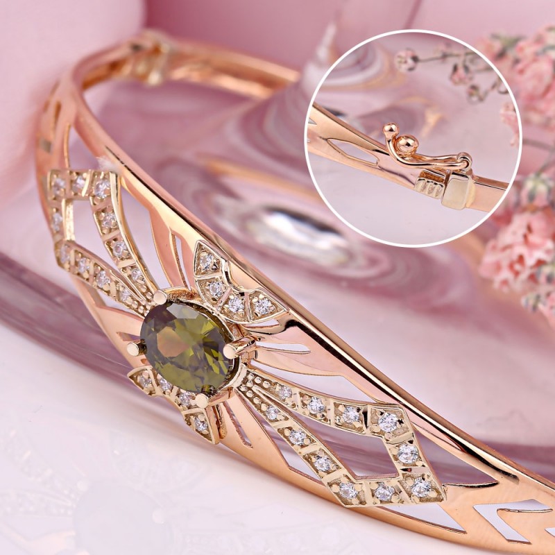 Ein elegantes Reifenarmband aus 585er Rot- und Weißgold mit Zirkonia - und Chrysolitheinsatz. Zuverlässiger Schiebeverschluss mit zusätzlicher Sicherheitsschlaufe.