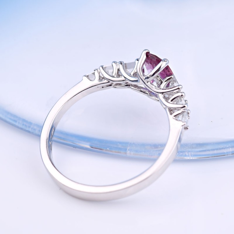 Einsatz: 6 Diamant Baguette 0,28 ct. Gsi; 1 pink Saphir 0,71 ct. oval 7,0 x 5,0 mm