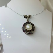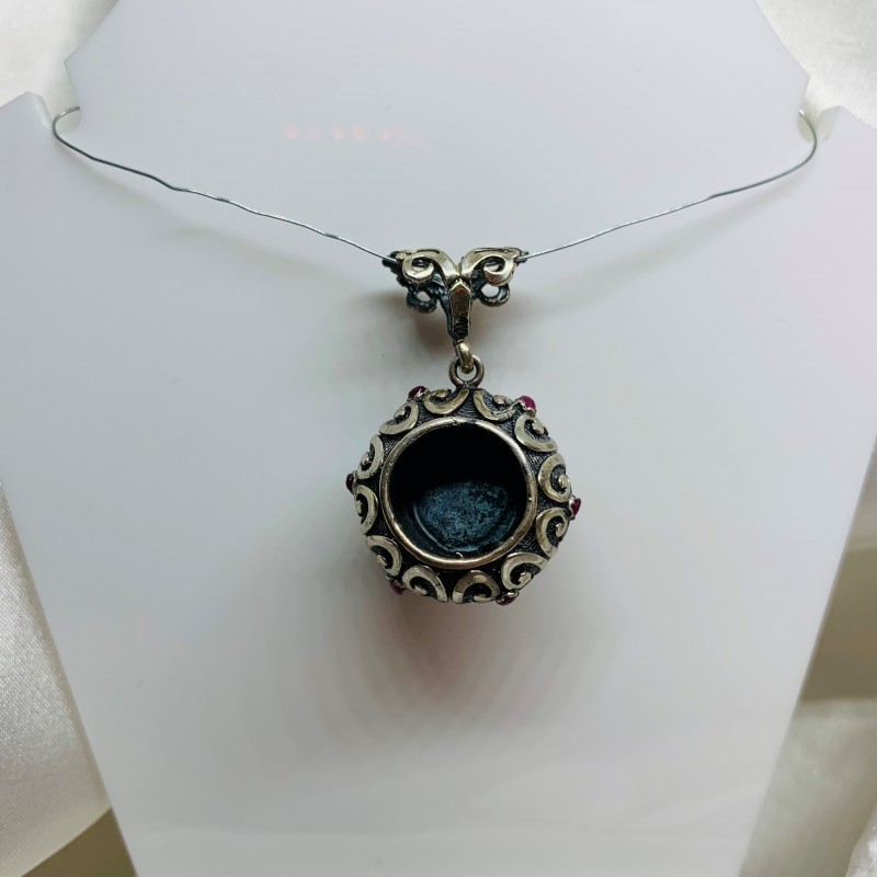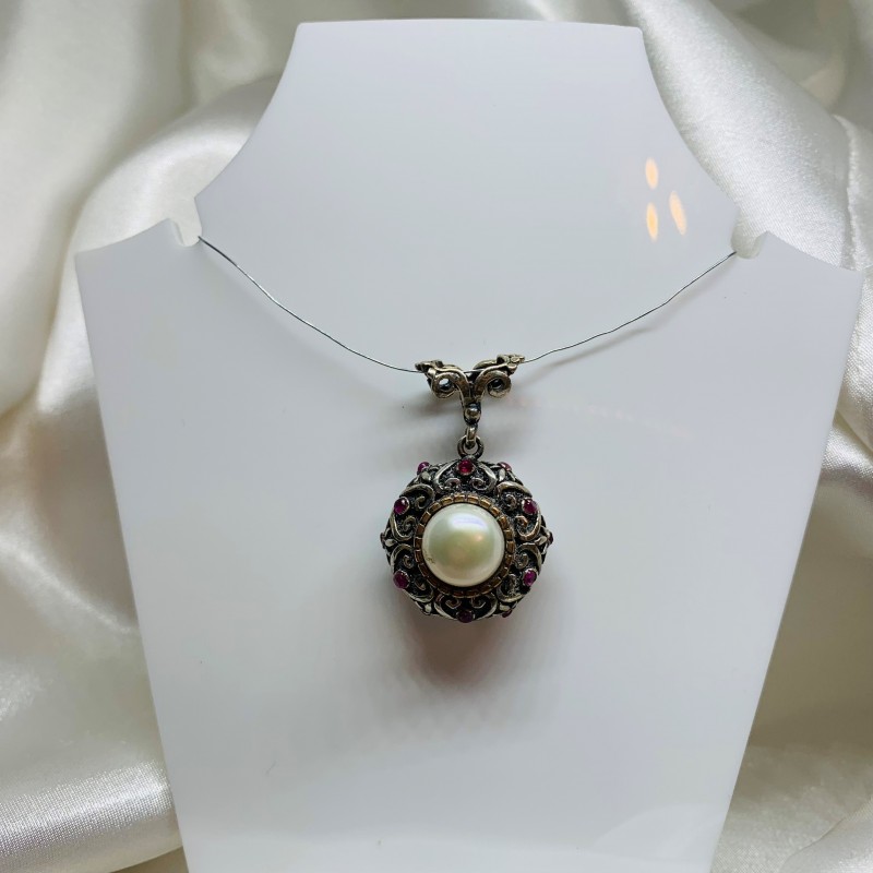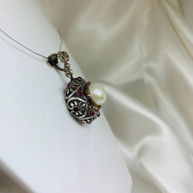 Schicker Ethno-Anhänger im osmanischen Stil, handgefertigt aus geschwärztem 925er Silber, mit eingesetzten Perlen, eingefasst mit edler Bronze, und Rubinen. Die Kombination verschiedener Metalle und Steine ist ein hervorragendes Geschenk für Ihre Geliebte, das die Zartheit, den Charme und die Natürlichkeit ihrer Schönheit sowie die Vielseitigkeit ihrer Persönlichkeit perfekt unterstreicht!