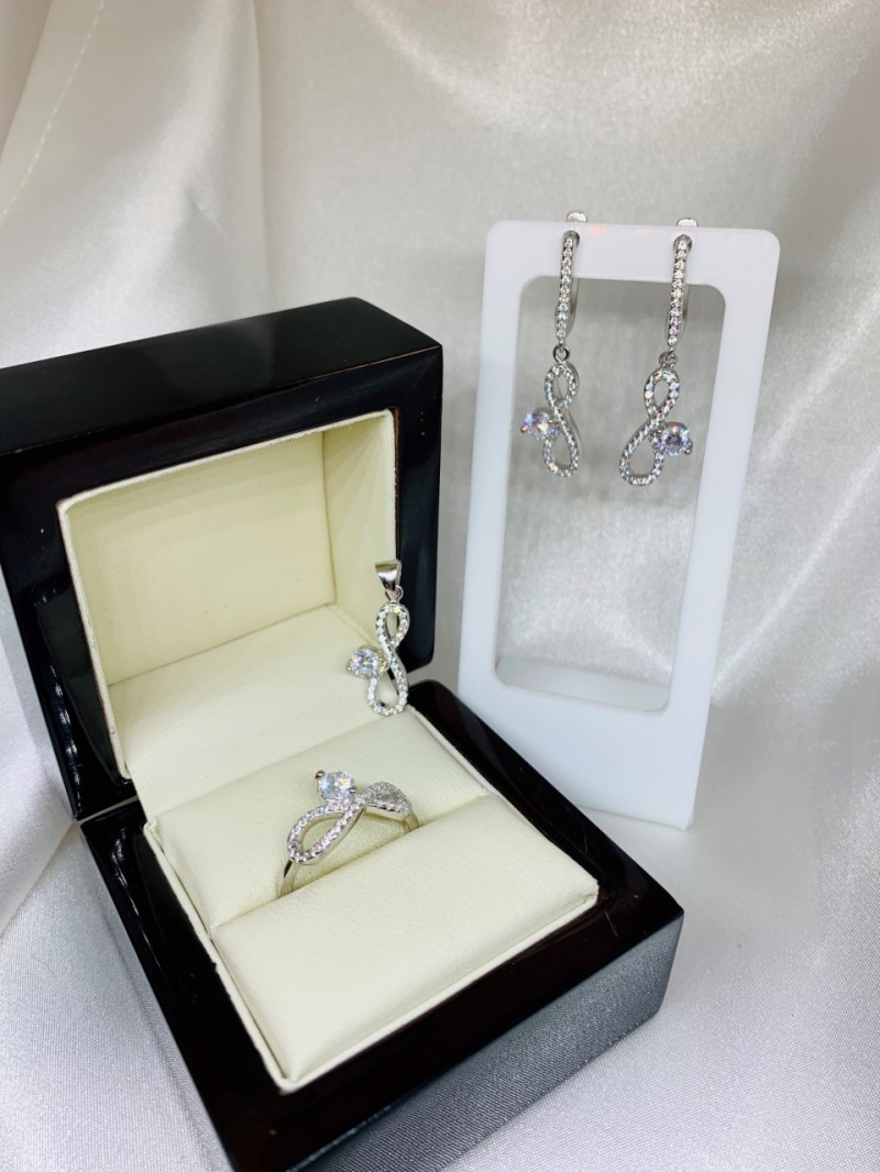 Ein entzückendes Set aus 925er Sterlingsilber mit Einsätzen aus funkelnden Zirkonia! Die Kombination dieser charmanten Steine in unterschiedlichen Größen verleiht dem Produkt ein einzigartiges Aussehen und fesselt das Auge. Ein solches Set wird die Zärtlichkeit, Weiblichkeit und den Charme seiner Herrin betonen!