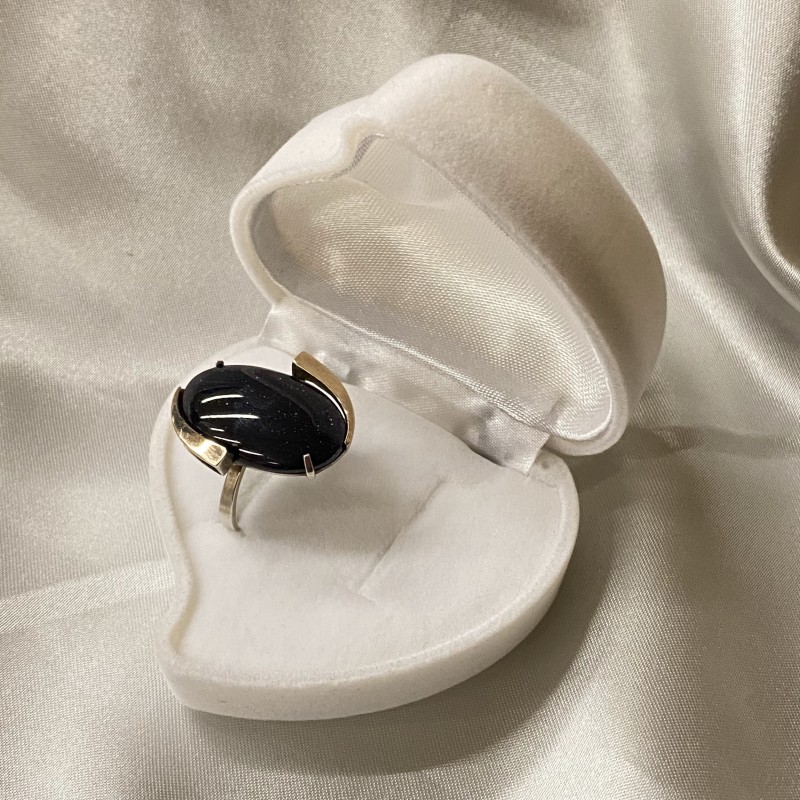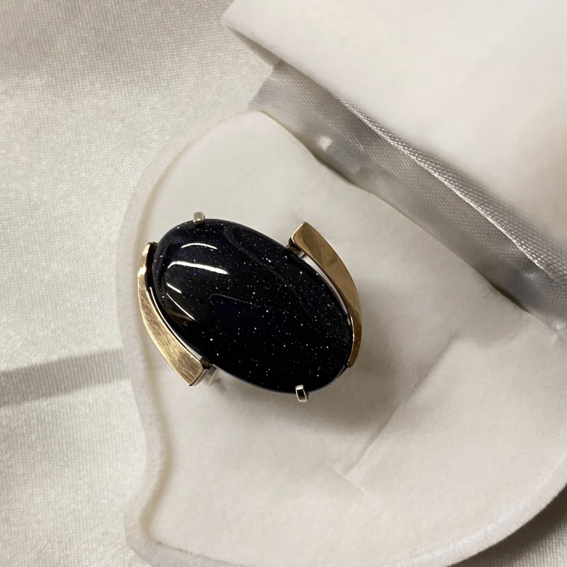 Ein entzückender Ring aus 925er Sterlingsilber mit einem großen Einsatz aus bezauberndem blauem Aventurin. Die blaue Art ist selten. Äußerlich ist es sehr attraktiv - wie ein Stück eines dunklen Sternenhimmels, der mit einer großen Anzahl von Sternbildern übersät ist.