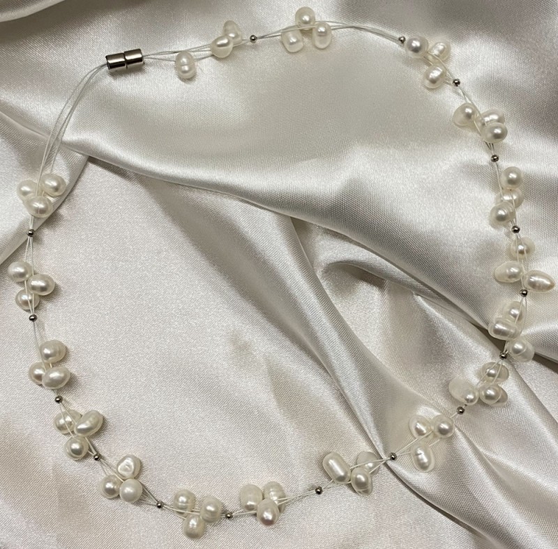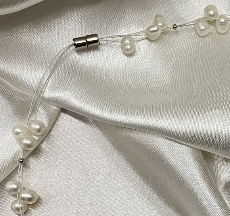 Очаровательное колье! На тройной белой леске нанизанны жемчужины, которые отделены серебряными шариками. Застёжка из серебра 925 пробы оснащенна магнитами, благодаря чему легко снимать и одевать это удивительное колье!