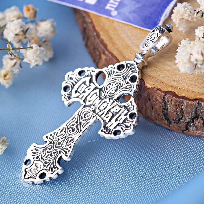 Silbernes Brustkreuz mit einem Kruzifix aus geschwärztem 925er Silber! Auf der Rückseite ist die Inschrift eingraviert: "Rette und bewahre". Kratzt nicht beim Tragen.