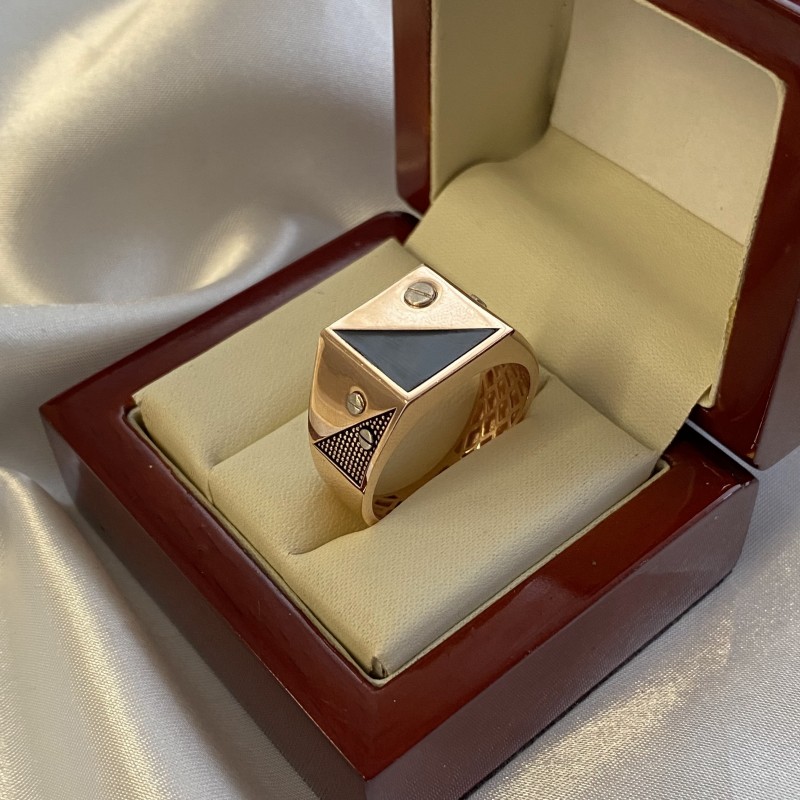 белого золота и узорами чернёного золота. Кольцо украшено чёрным ониксом. На внутренней закрытой поверхности кольца нанесен штамп с пробой золота.