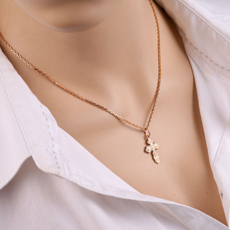 Halskette aus vergoldetem 925er Silber mit einem Kreuzanhänger! Auf der Rückseite ist eine Inschrift: "Rette und bewahre" eingraviert. Ankerweben mit Diamantschliff.