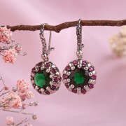 Schicke Ethno-Ohrhänger im osmanischen Stil, handgefertigt aus geschwärztem 925er Sterlingsilber mit großem Einsatz aus grünem Turmalin, funkelnden Smaragden und Rubinen! Die Ohrringe sind mit einem durchbrochenen Reliefmuster verziert, das den antiken Stil des Produkts unterstreicht.