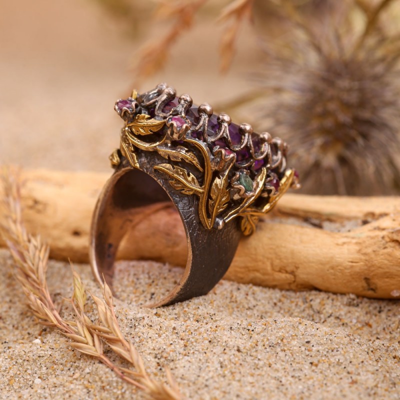 Schicker Ethno-Ring im osmanischen Stil, handgefertigt aus geschwärztem 925er Sterlingsilber mit großem Einsatz aus Amethyst, Smaragden und Rubinen! Der Ring ist mit einem durchbrochenen Reliefmuster aus edler Bronze verziert, das den antiken Stil des Produkts unterstreicht. Frauen haben lange versucht, ihre Schönheit, Zerbrechlichkeit und ihren Charme mit Schmuck zu betonen. Orientalischer Damenschmuck hat viele Gesichter. Sie können sowohl Anmut und Bescheidenheit als auch Extravaganz des Bildes betonen.
