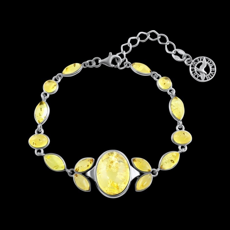Ein festliches feminines Armband aus rhodiniertem 925er Silber verziert mit Bernstein, mit diesem erstaunlichen "Stück der Sonne", das in allen Schattierungen von Honigfarbe spielt, verzaubert und mit seiner Schönheit besticht, wird Sie immer wieder begeistern! Eine einzigartige Gelegenheit, Ihre Individualität zu betonen, das Bild von Weiblichkeit und Zärtlichkeit zu vermitteln. Eine schöne Kombination aus glitzerndem Silber und sonnigem Bernstein verleiht Ihrem Look eine festliche Stimmung!