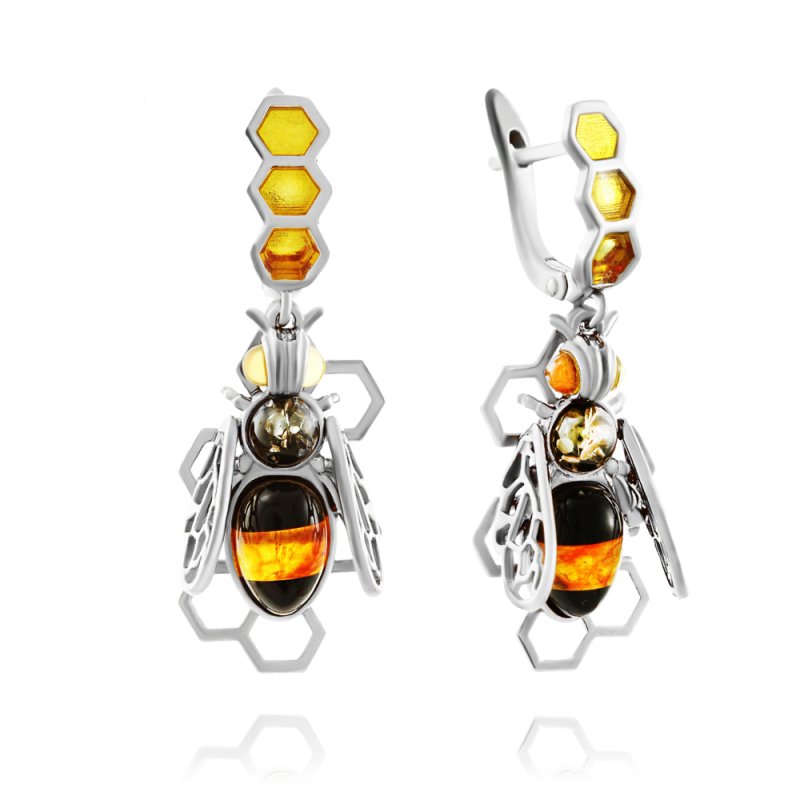 Wunderschöne Ohrhänger in Form von Honigbienen aus Silber 925 Probe (rhodiniert! + Emaille), mit Bernstein, erstaunlichen "Stück der Sonne" in verschiedenen Farben! Eine einzigartige Gelegenheit, Ihre Individualität zu betonen, das Bild von Weiblichkeit, Sonnenschein und Zärtlichkeit zu vermitteln.