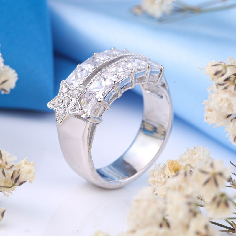 Romantischer, zarter Ring mit bezaubernd funkelnden Zirkonia in zwei Reihen angeordnet. Dazwischen befindet sich ein Sterneinsatz, der sich über die gesamte Breite des Rings bewegt. Originell und charmant! Der Ring wirkt prägnant und stilvoll in einem wunderschönen Rahmen aus 925er Sterlingsilber und schafft eine helle und lebendige Komposition. Es wird die Zartheit, den Charme und die natürliche Schönheit Ihrer Hände perfekt betonen!