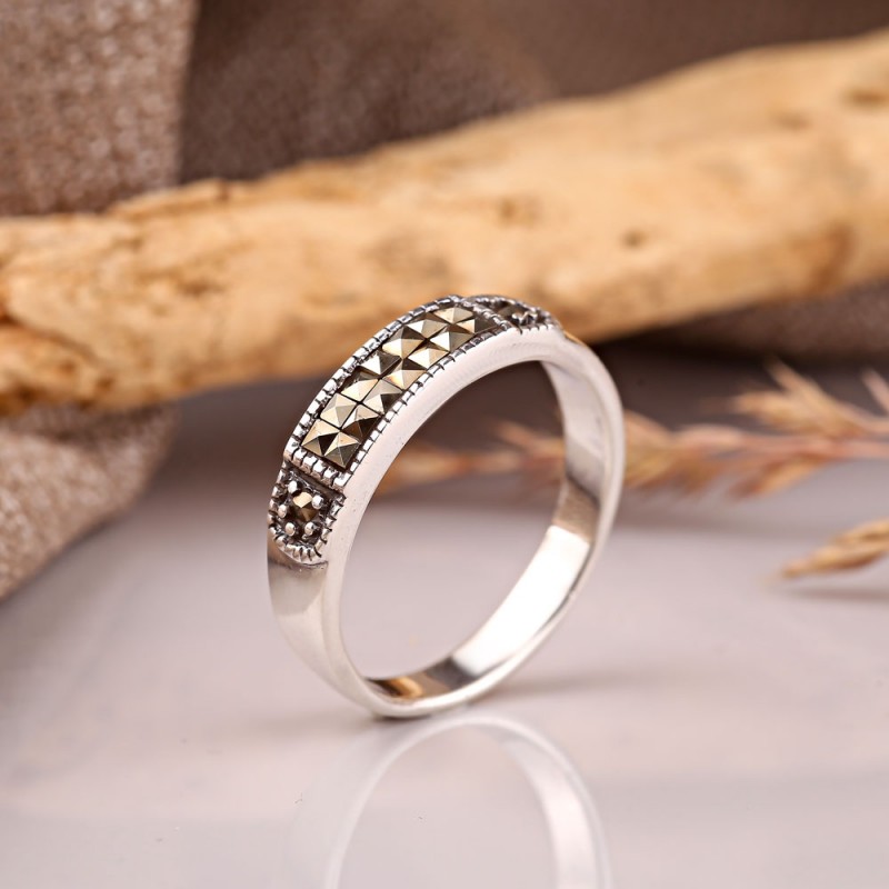 Original Ring aus geschwärztem 925er Sterlingsilber mit tiefen Markasit-Einsätzen. Ein solcher Ring wird die Verfeinerung des Geschmacks betonen. Es ist universell und daher sowohl für Männer als auch für Frauen geeignet.
