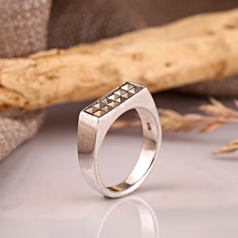 Original Ring aus geschwärztem 925er Sterlingsilber mit tiefen Markasit-Einsätzen. Ein solcher Ring wird die Verfeinerung des Geschmacks betonen. Es ist universell und daher sowohl für Männer als auch für Frauen geeignet.