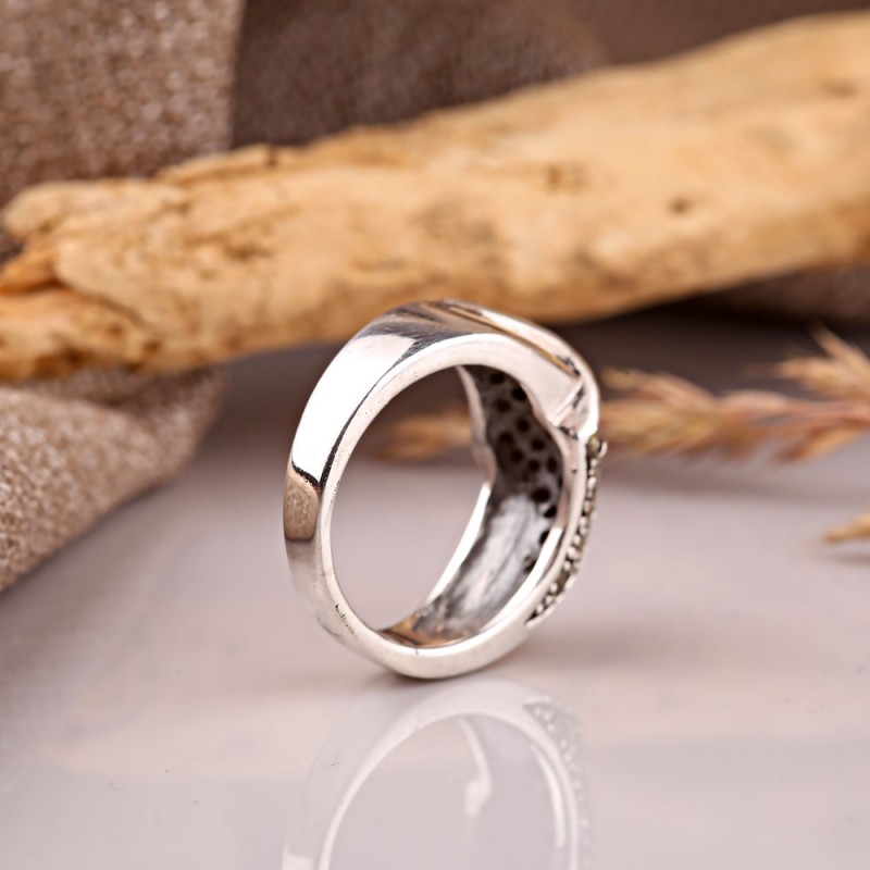 Original Ring aus geschwärztem 925er Sterlingsilber mit tiefen Markasit-Einsätzen. Ein solcher Ring wird die Verfeinerung des Geschmacks betonen und die Schönheit der weiblichen Hände.