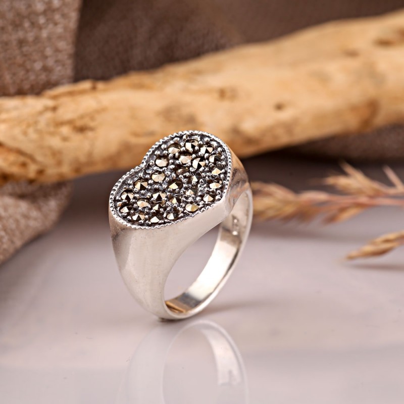 Original Ring aus geschwärztem 925er Sterlingsilber mit tiefen Markasit-Einsätzen. Ein solcher Ring wird die Verfeinerung des Geschmacks betonen und die Schönheit der weiblichen Hände.
