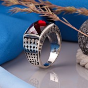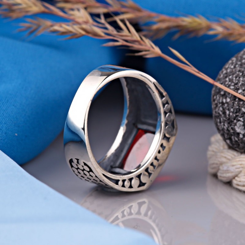Herren Ring aus geschwärztem 925er Silber, verziert mit großem funkelnden Granat und durch Diamantschneiden erzeugtes Muster. Jeder Mann möchte seinen eigenen stilvollen Akzent haben, eine teure Sache, die den Status unterstreicht.