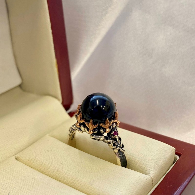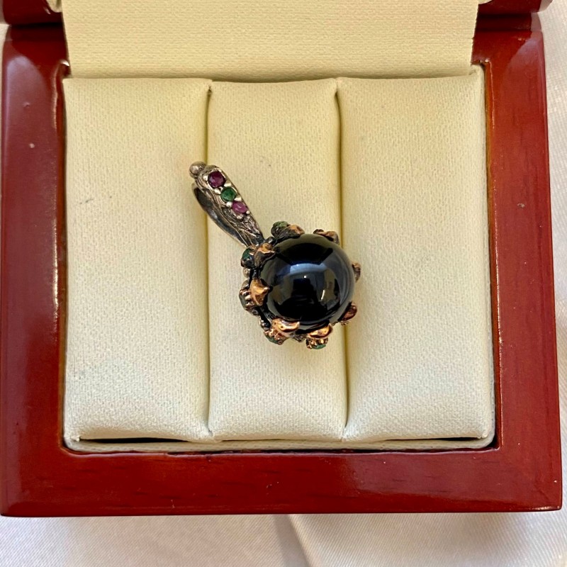 Handgefertigtes Set aus geschwärztem 925er Silber mit einzigartigem Achat in einem bronzebeschichteten Rahmenund Einsätzen aus Smaragden und Rubinen! Der Bügel des Rings ist mit einem filigranen Prägemuster verziert, das den antiken Stil des Produkts unterstreicht.
