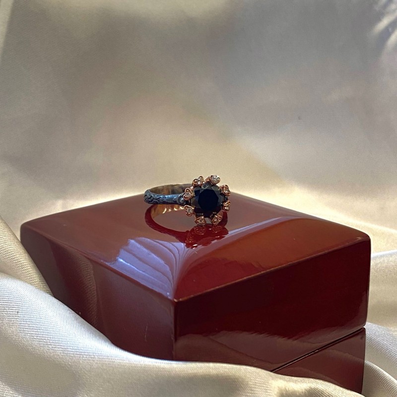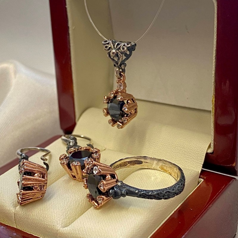 Die Schwärzung erzeugt zusätzliche Schattierungen, die die Brillanz und Tiefe der Steine ​​verstärken und dem Produkt ein vollendetes Aussehen verleihen. Das Schwärzen von Schmuck ermöglicht es Ihnen, den Ton des Materials zu schattieren. Solche Produkte sehen reich und elegant aus.