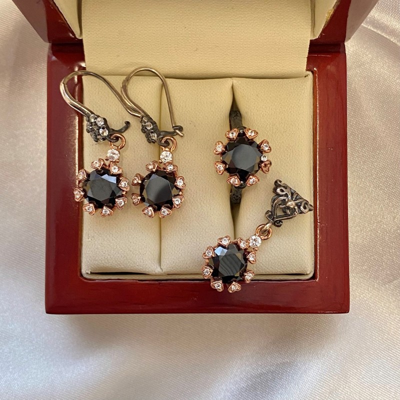 Handgefertigtes Set aus geschwärztem 925er Silber mit einzigartigem Onyx in einem bronzebeschichteten Rahmen und Zirkoniaeinsätzen! Der Bügel des Rings ist mit einem filigranen Prägemuster verziert, das den antiken Stil des Produkts unterstreicht.