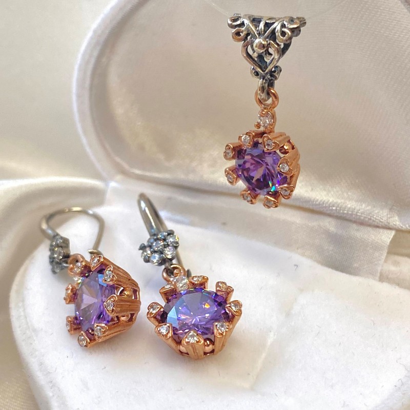 Handgefertigtes Set aus geschwärztem 925er Silber mit einzigartigem Amethyst und Zirkonia in einem bronzebeschichteten Rahmen! Der Bügel des Rings ist mit einem filigranen Prägemuster verziert, das den antiken Stil des Produkts unterstreicht.