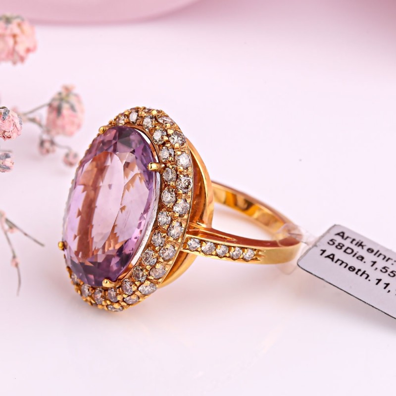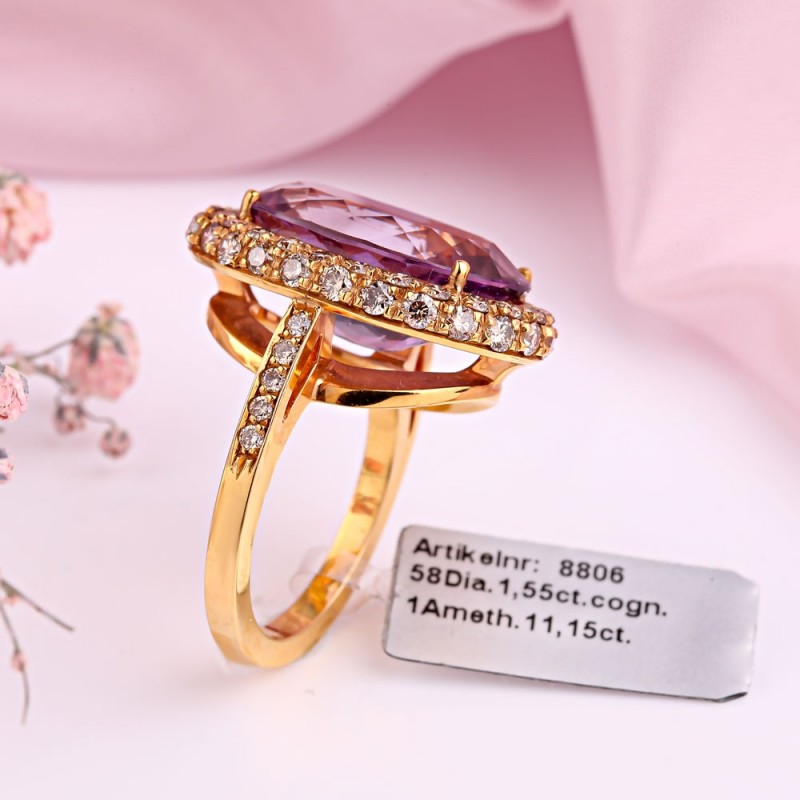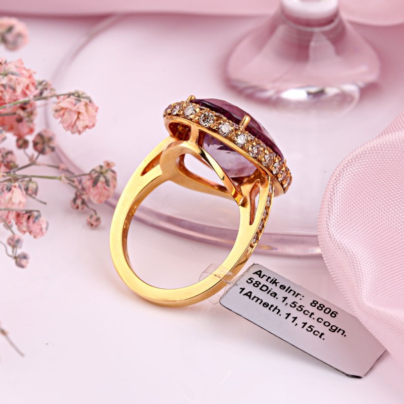 Einsatz: 58 Diamanten 1,55 ct. Cognacfarbe; 1 Amethyst oval 11,15 ct. 18,0 x 13,0 mm