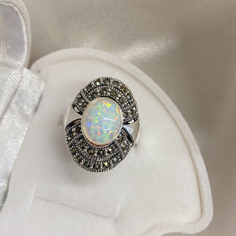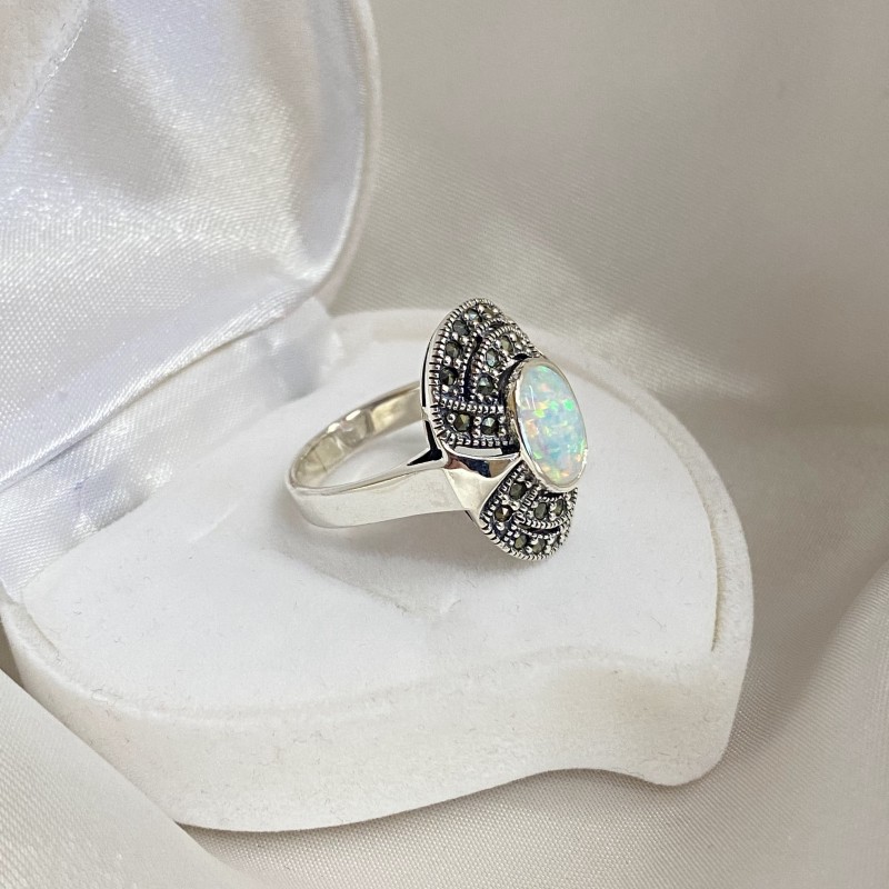 Wunderschöner Ring aus geschwärztem 925er Sterlingsilber mit bezaubernden Opal- und tiefen Markasit-Einsätzen. Ein solcher Ring wird die Verfeinerung des Geschmacks betonen und Ihnen das Gefühl geben, eine echte Königin zu sein.