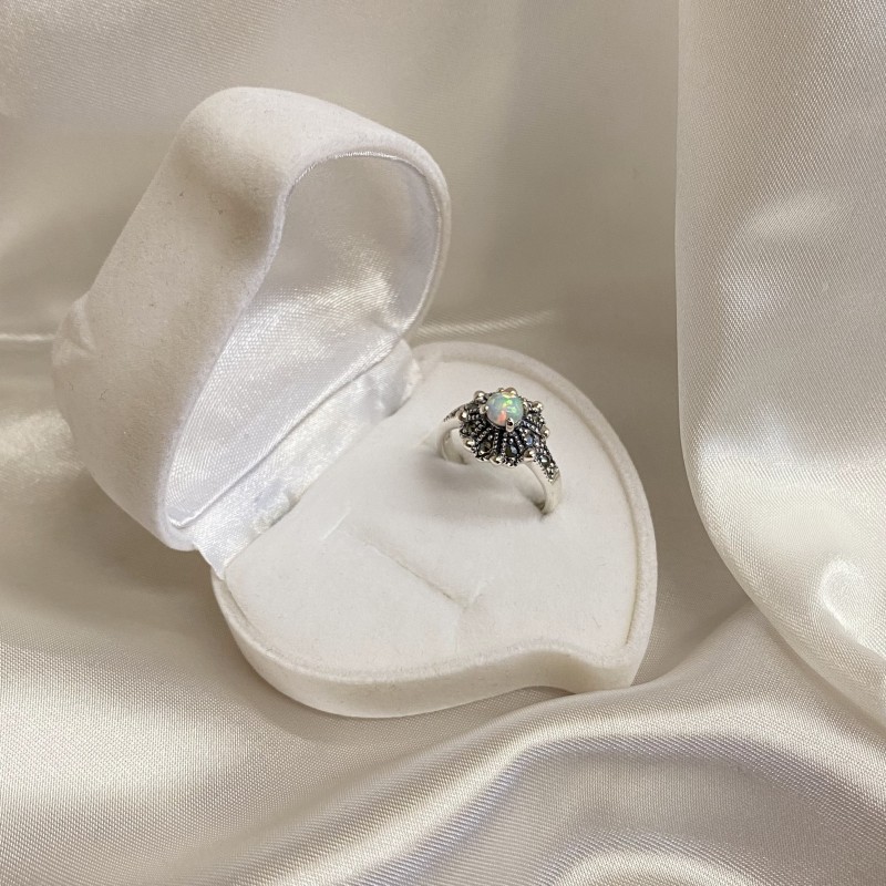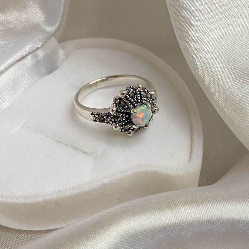 Wunderschöner Ring aus geschwärztem 925er Sterlingsilber mit bezaubernden Opal- und tiefen Markasit-Einsätzen. Ein solcher Ring wird die Verfeinerung des Geschmacks betonen und Ihnen das Gefühl geben, eine echte Königin zu sein.