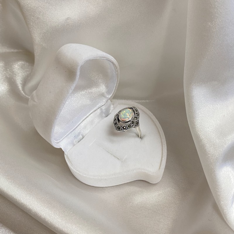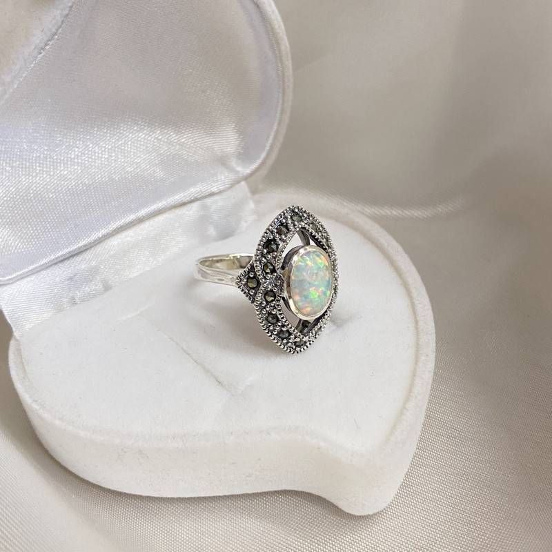 Wunderschöner Ring aus geschwärztem 925er Sterlingsilber mit bezaubernden Opal- und tiefen Markasit-Einsätzen. Ein solcher Ring wird die Verfeinerung des Geschmacks betonen und Ihnen das Gefühl geben, eine echte Königin zu sein.