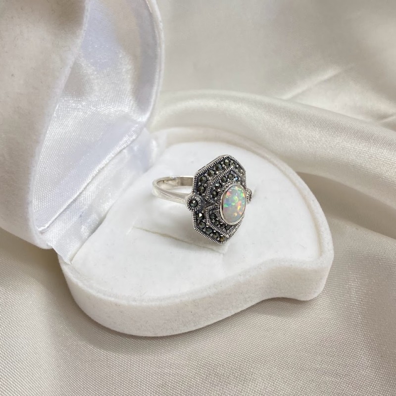 Wunderschöner Ring aus geschwärztem 925er Sterlingsilber mit bezaubernden Opal- und tiefen Markasit-Einsätzen. Ein solcher Ring wird die Verfeinerung des Geschmacks betonen und Ihnen das Gefühl geben, eine echte Königin zu sein.
