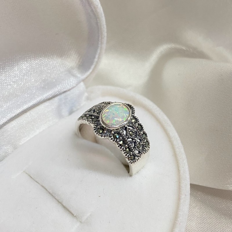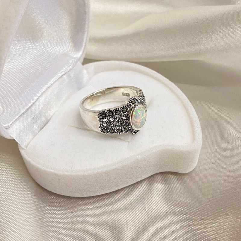 Wunderschöner Ring aus geschwärztem 925er Sterlingsilber mit bezaubernden Opal- und tiefen Markasit-Einsätzen. Ein solcher Ring wird die Verfeinerung des Geschmacks betonen und Ihnen das Gefühl geben, eine echte Königin zu sein.