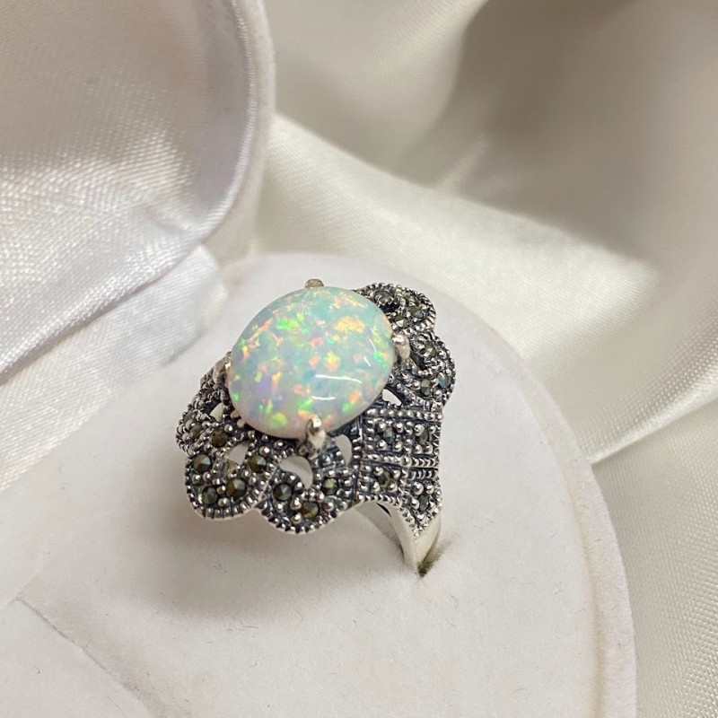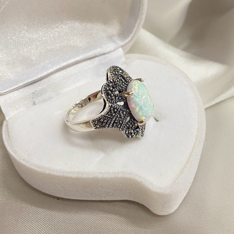 Wunderschöner Ring aus geschwärztem 925er Sterlingsilber mit bezaubernden Opal- und tiefen Markasit-Einsätzen. Ein solcher Ring wird die Verfeinerung des Geschmacks betonen und Ihnen das Gefühl geben, eine echte Königin zu sein.