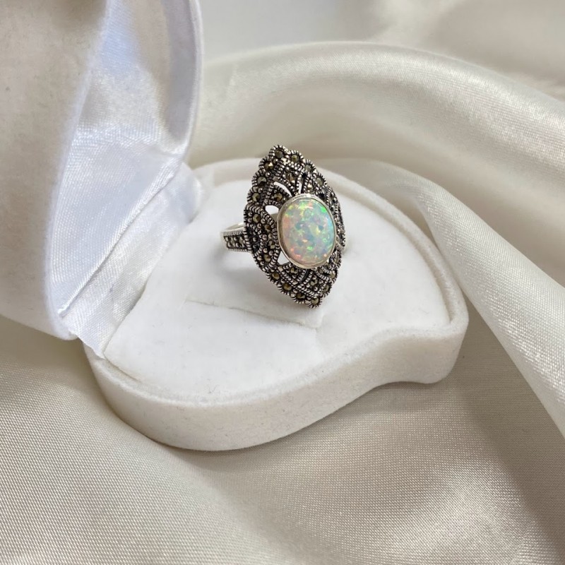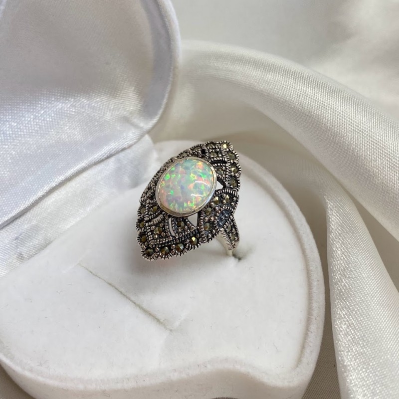 Wunderschöner Ring aus geschwärztem 925er Sterlingsilber mit bezaubernden Opal- und tiefen Markasit-Einsätzen. Ein solcher Ring wird die Verfeinerung des Geschmacks betonen und Ihnen das Gefühl geben, eine echte Königin zu sein.