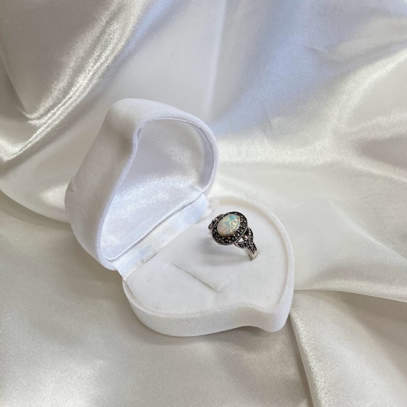 Wunderschöner Ring aus geschwärztem 925er Sterlingsilber mit bezaubernden Opal- und tiefen Markasit-Einsätzen. Ein solcher Ring wird die Verfeinerung des Geschmacks betonen und Ihnen das Gefühl geben, eine echte Königin zu sein.