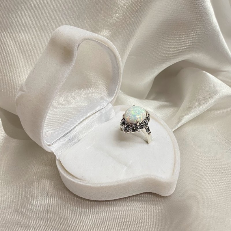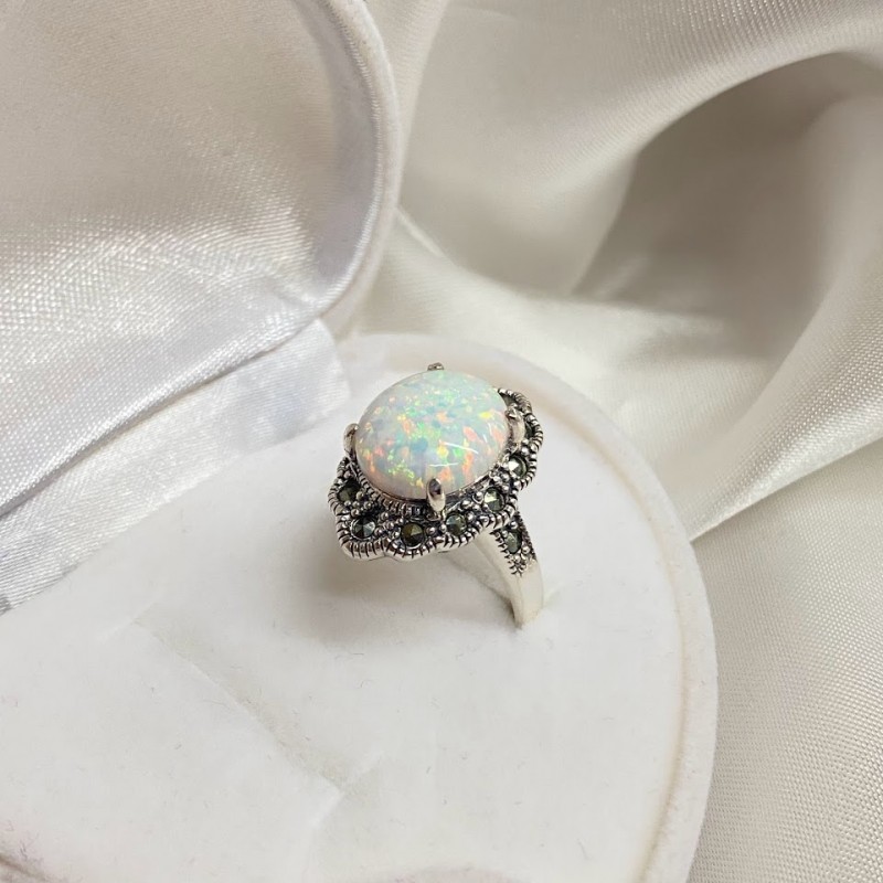 Wunderschöner Ring aus geschwärztem 925er Sterlingsilber mit bezaubernden Opal- und tiefen Markasit-Einsätzen. Ein solcher Ring wird die Verfeinerung des Geschmacks betonen und Ihnen das Gefühl geben, eine echte Königin zu sein.