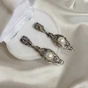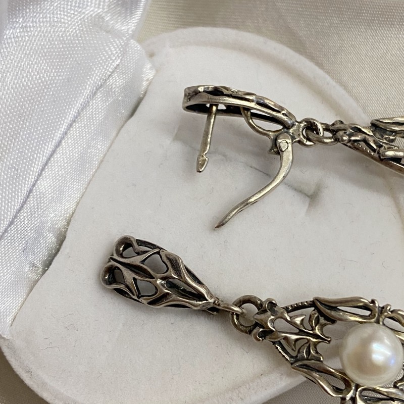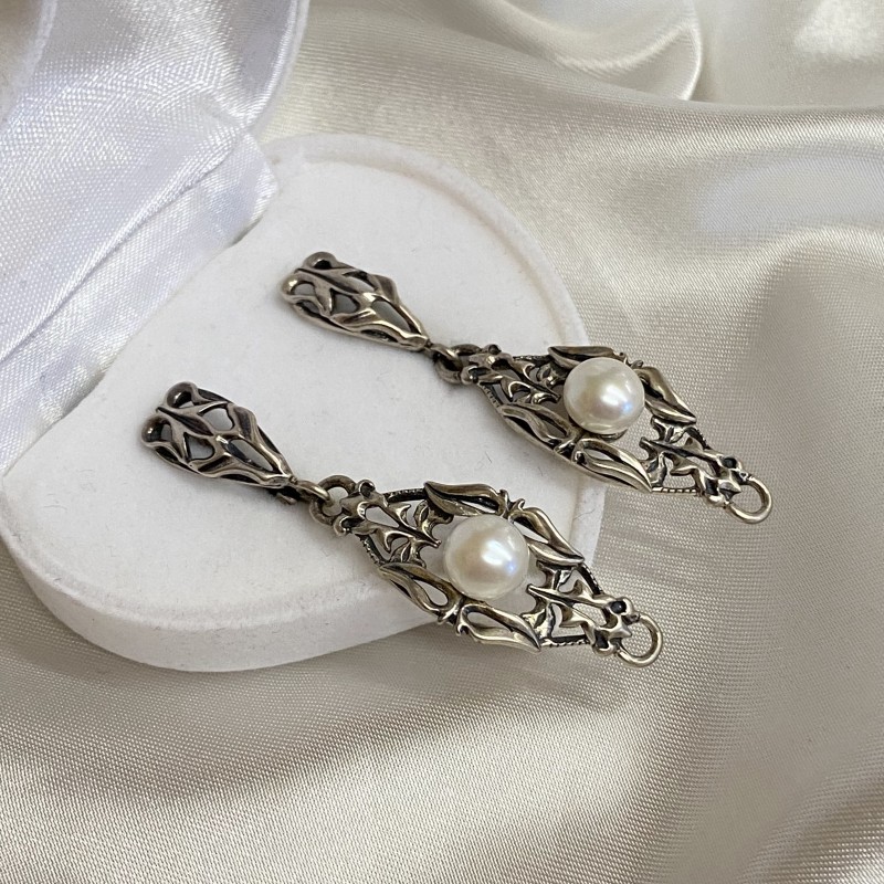 Originelle Ohrhänger im antiken Stil sind aus geschwärztem Silber 925 gefertigt, verziert mit zarten Perlen! Solche Ohrringe strahlen Chic und Unwiderstehlichkeit aus! Perlenschmuck unterstreicht den hohen sozialen Status seiner Besitzer und hebt sich von anderen Schmuckstücken ab.